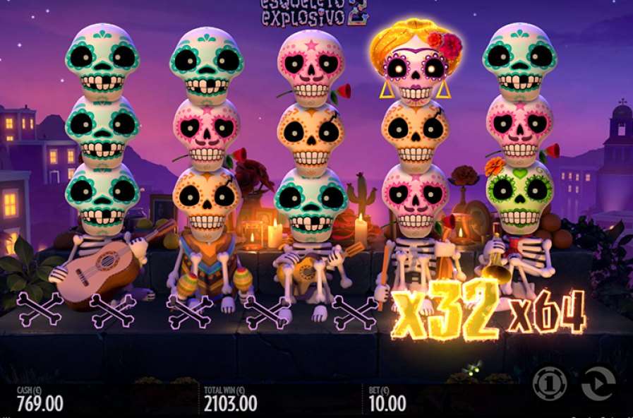 AY AY AY! Enrico Mortis and his mariachi band are finally back. Esqueleto Explosivo 2 features dropping symbols, Explosivo Wilds, Mucho Multipliers and a Bonus Game with free spins!
