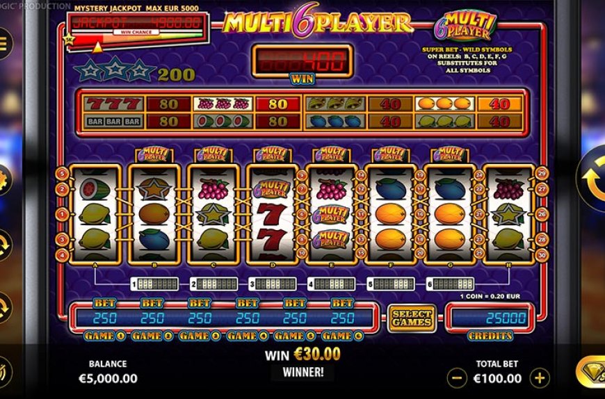 Multi 6 Player is a classic style fruit machine game with three (3) rows and from three (3) up to eight (8) reels. The colorful reels are filled with retro fruit machine symbols. Play on the ONE (1) GAME with five (5) win lines and three (3) reels or switch to the SIX (6) GAMES with thirty (30) win lines and eight (8) reels for higher chances of bigger wins.