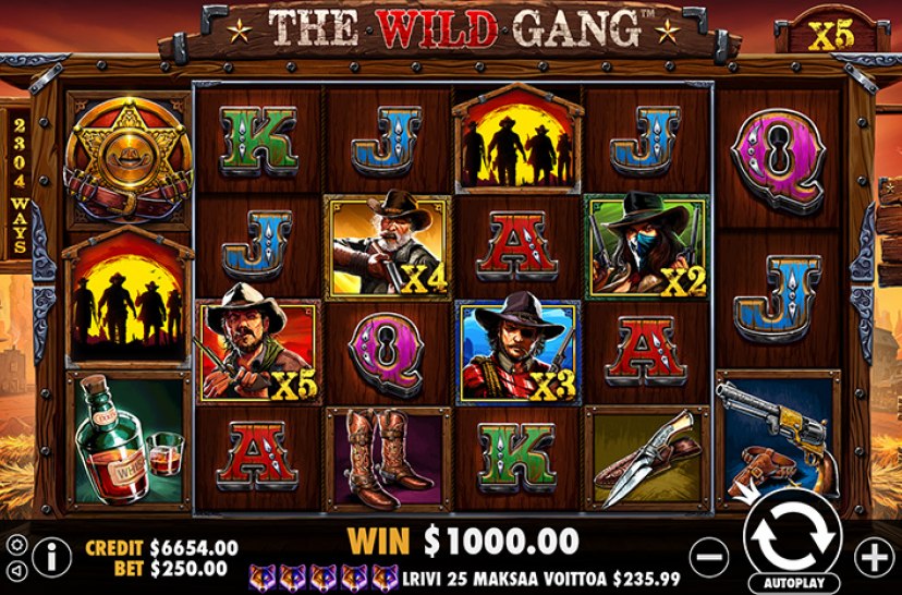 Don your cowboy boots and saddle up for a Western adventure with The Wild Gang. This Slot presents a unique reel formation, with symbols including blades, bottles, and sheriff badges appearing on the grid.